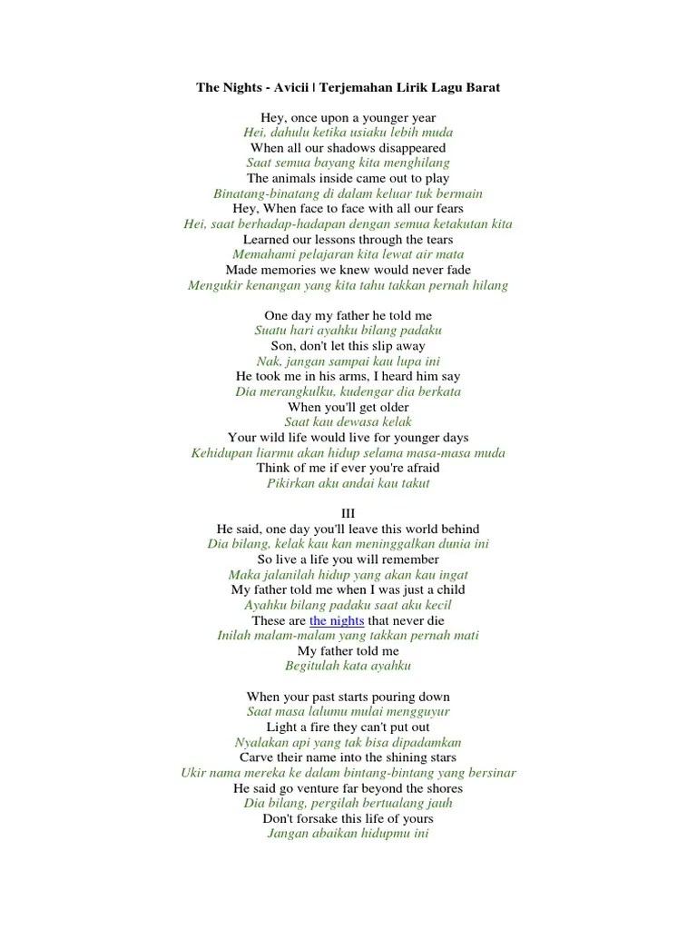 Berikut lirik dan terjemahan lagu 'the nights' yang dinyanyikan oleh avicii. He said, one day you'll leave this world behind. Country music, dance/electronic, pop, house. The nights diciptakan oleh : 'the nights' merupakan salah satu lagu dari dj asal swedia, tim bergling alias avicii.